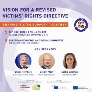 Together with Saskia Bricmont, Victim Support Europe (VSE) are delighted to invite you to the event “Vision for a revised Victims’ Rights Directive”, taking place on 16 November 2022, from 2 to 4 pm CET.