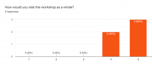 Participants were also asked to rate the Safe justice workshop if they attended it. Of those who filled out the feedback form, five people attended the workshop. The respondents rated the workshop very highly as a whole (see Figure 3). More specifically, participants enjoyed the format of the workshop and the level of interaction it produced. Answering the question “What did you like most about the workshop”, one participant wrote:
