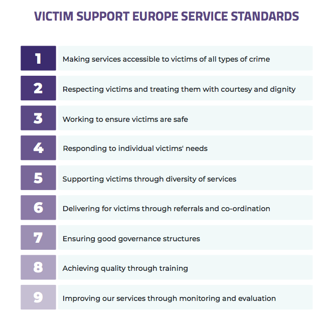 Victim Support Europe has developed minimum standards for victim support organisations around the European Union and beyond. These standards can serve both as a guideline to accreditation to become a VSE Member organisation and, more broadly, to assist victim support organisations in setting up and evaluating their services.